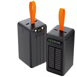 باور بنك شمسي محمول من Aspor موديل A377 بقدرة شحن 22.5 واط، متوفر بسعتين 60000 و80000 مللي أمبير، يدعم الشحن السريع، الشحن اللاسلكي، ومزوّد بكابلات مدمجة مع أنظمة حماية متعددة.